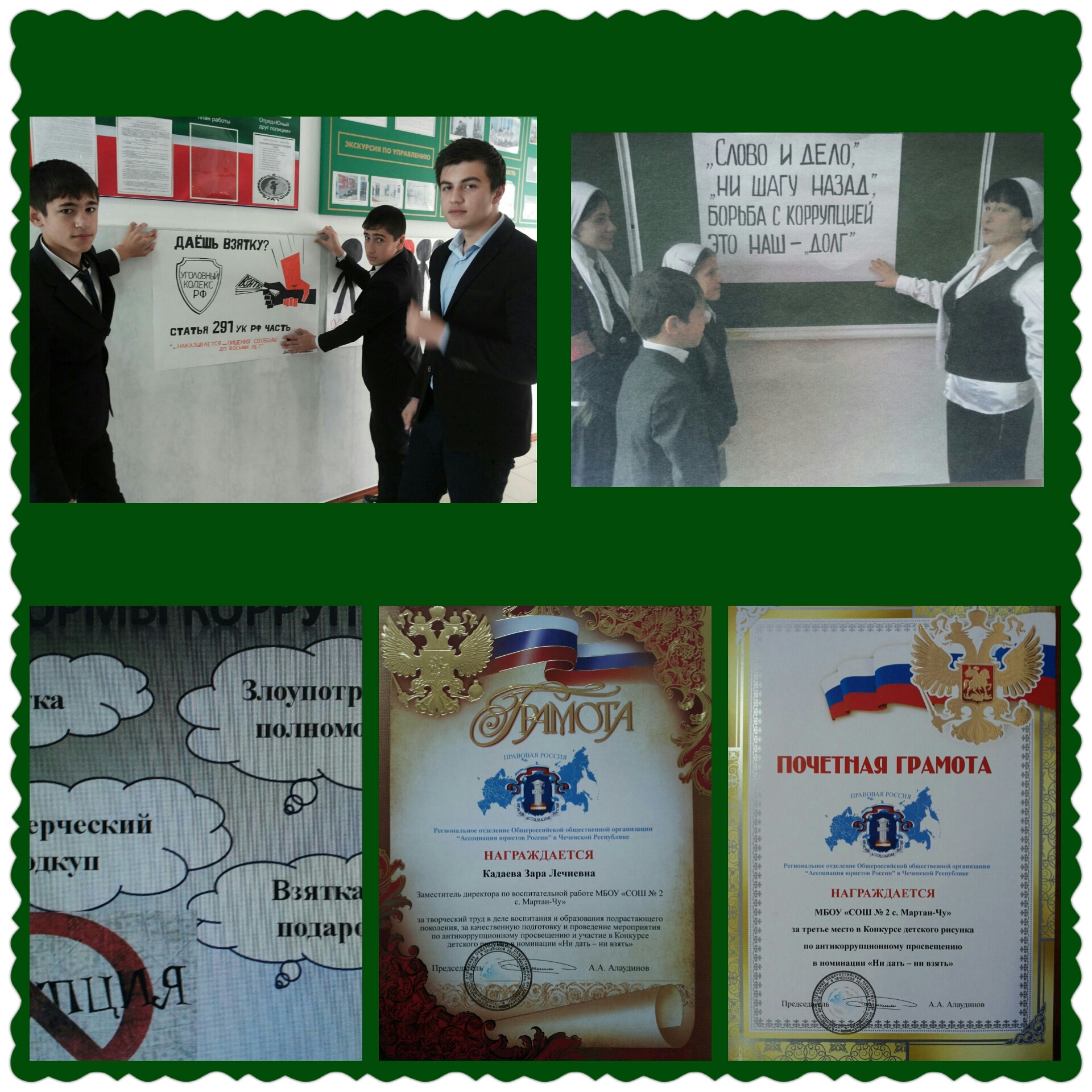 17.11.2015Общешкольное мероприятие "Без коррупции с детства". Цель: воспитывать ценностные установки и развивать способности, необходимые для формирования у молодых людей гражданской позиции в отношении коррупции, формировать у обучающихся позитивную оценку таких нравственных качеств как: целеустремленность, трудолюбие, скромность, воспитывать уважение к национальным традициям, побуждать к самосовершенствованию, саморазвитию, самообразованию. Мероприятие проведено зам. дир. по ВР Кадаевой З.Л. Награждена грамотой за творческий труд в деле воспитания и образования подрастающего поколения, за качественную подготовку и проведение мероприятия по антикоррупционному просвещению, за подписью председателя "Ассоциация юристов России" А.А.Алаудинова