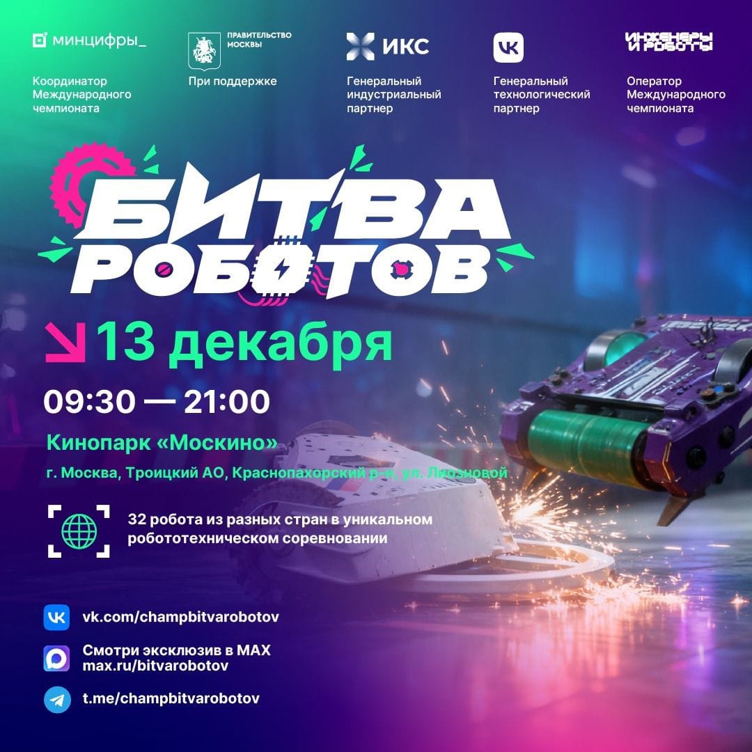 13 декабря в Москве в манеже кинопарка «Москино» пройдет финальный этап международного чемпионата «Битва роботов» сезона 2025 года.