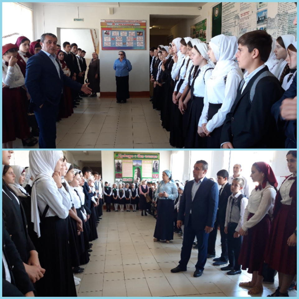 Начало рабочего дня. На линейке у нас присутствовал начальник УО Гучигов З.А.